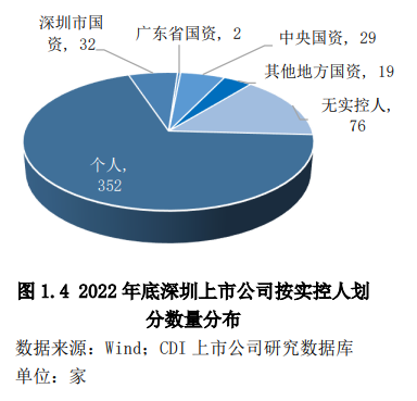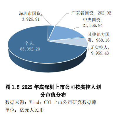 截至2022年底,深圳上市公司总市值规模超12万亿,同比下降接近两成。其中软件与信息技术服务行业上市公司市值总和最高,达到31215.61亿元,占比25.46%,金融行业上市公司市值总和为26861.67亿元,占比21.91%,硬件与半导体行业上市公司市值总和为17031.11亿元,占比13.89%,三者合计占比达61.25%,与去年同期相比下降约两个百分点。腾讯控股、招商银行和中国平安3家市值最大的头部上市公司,分别属于软件与信息技术服务和金融行业,合计市值占比约为38%。南山、福田两区上市公司量合计超半数,市值占比超三分之二。非国有企业构成深圳上市公司的主体,在上市公司数量和市值上均大幅领先国有上市企业,深圳市属国资上市公司数量市值较低。