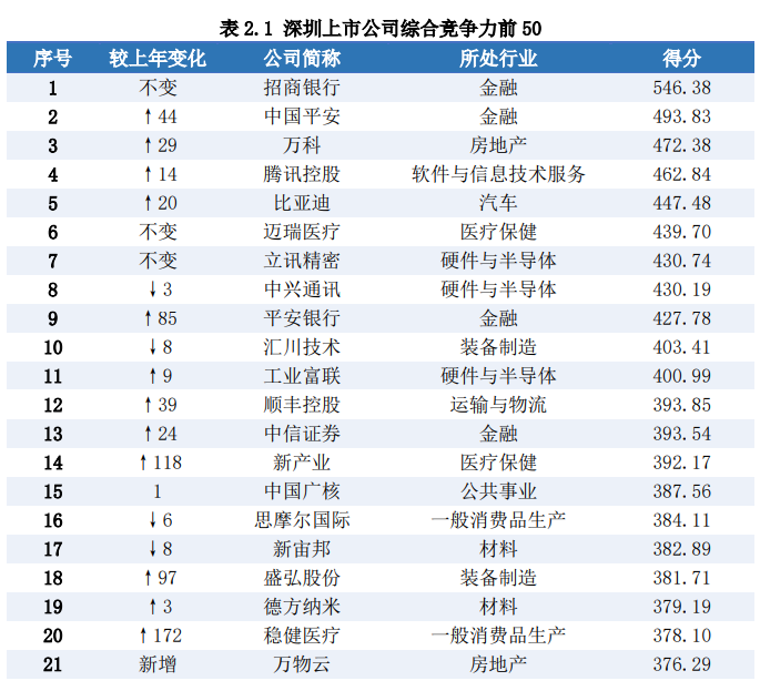 ——综合竞争力十强依次是:招商银行、中国平安、万科、腾讯控股、比亚迪、迈瑞医疗、立讯精密、中兴通讯、平安银行、汇川技术。