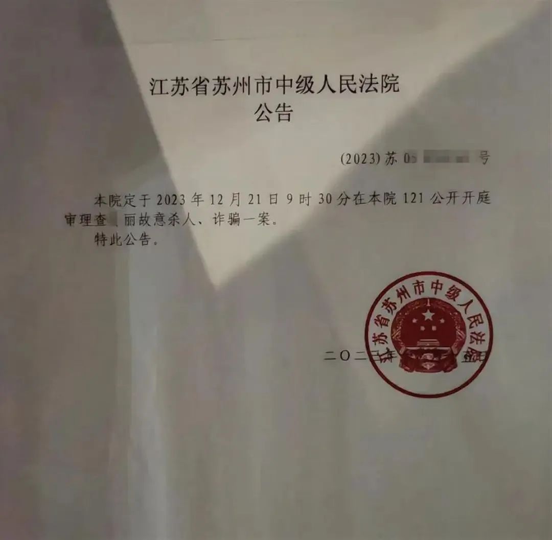 12月20日晚,记者在苏州中院公告栏看到,该院12月15日发布公告称,定于12月21日9时30分在该院121公开开庭审理查某丽故意杀人、诈骗一案。