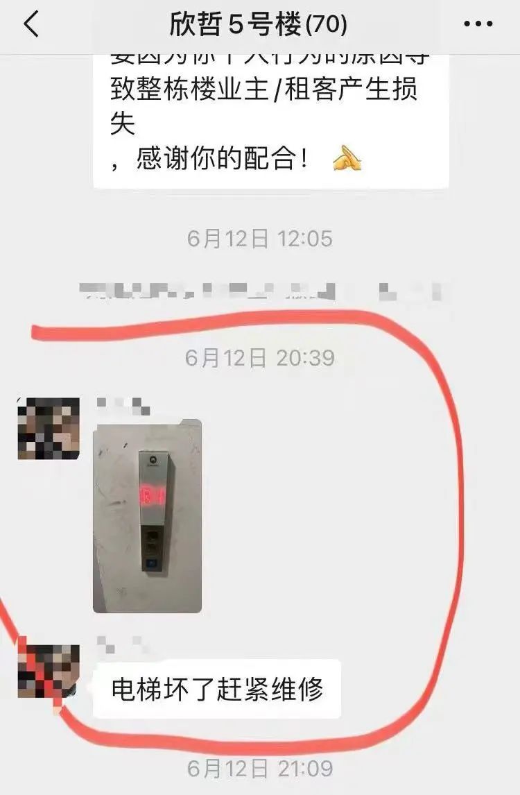 今年6月12日,电梯维保公司工作人员在群里发了一条消息称:5号楼电梯零件损坏,已上报购买。然而6月23日,仍有业主在群里表示,“靠近右侧的这部电梯,好几次都是从下往上走的时候到了17楼,电梯门开不了,而且电梯摇摇欲坠,我们真的很害怕。请你们务必检查一下……”