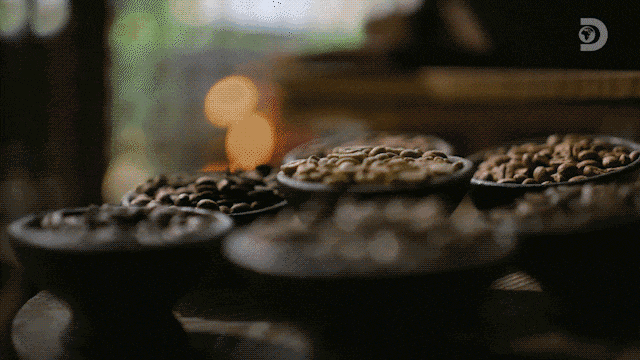 你是否发现此时的咖啡豆,并不是我们常见的深褐色模样?没错,仅经过风干处理后的咖啡豆此时还是生豆子,距离它被碾磨、萃取最终成为一杯咖啡,还需重要的一步——烘焙。