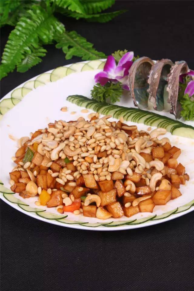 3.锅留底油烧至四成热,下葱姜末爆香,下入拉过油的鲍鱼丁、杏鲍菇丁、辣椒粒,加美极鲜味汁、盐、白糖调味,快速翻炒出香后盛出装盘,表面点缀炸好的腰果、松子即成。
