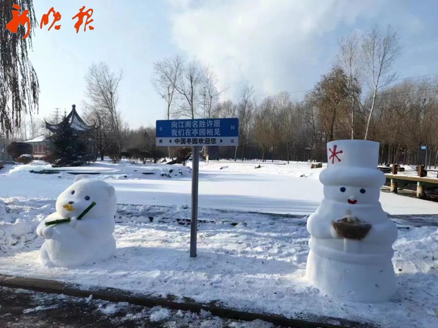 位于香坊区油坊街的中国亭园是雪人造型比较集中的公园。今冬,香坊区园林部门在中国亭园主入口、四合院、人工湖等显著位置,修建了10组共计20个雪雕雪人造型,每组分别以“亭亭”和“园园”命名,这些雪人造型生动乖巧、活泼别致,“亭亭”头戴雪花标志礼帽,手捧元宝,乌黑的眼睛、微微上扬的嘴角,寓意送福送财送吉祥;“园园”以国宝大熊猫造型呈现,圆滚滚的身子,憨态可掬,有的捧着竹子、有的攥着竹叶,形态各不相同。