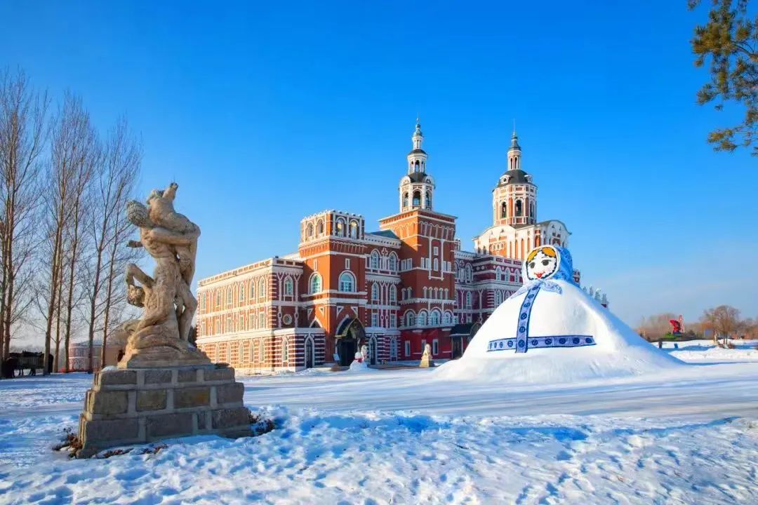 3.伏尔加庄园在伏尔加庄园,也能欣赏到充满异域风情的建筑和雪景。比如,俄罗斯套娃造型的萌萌大雪人。