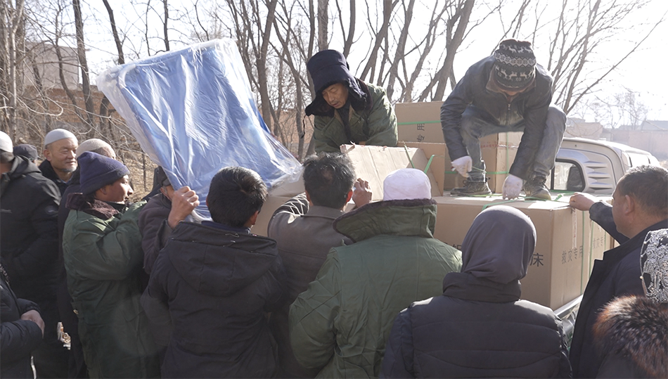 在食物和帐篷之外,能让人离开冰冷地板入睡的折叠床,成了抢手的物资。陆朝旭安排了大货车,和镇政府工作人员合作,将折叠床送到附近村子的村口。在受灾最严重的周家村,大货车一到村口,村民就聚在一起,等待救援队员和村干部把折叠床卸下。还有村民马上跑回家中,把电动三轮车开过来,把折叠床运回家里。