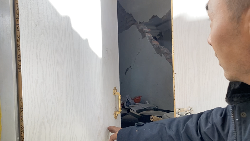 陕玉清对记者说起,地震隔天,他回去自己的房子,取几件棉衣和妻子的手机,过道上,玻璃碴混着墙体开裂后的碎砖,有个房间墙上直接豁了个洞,帘子被掩在灰里。