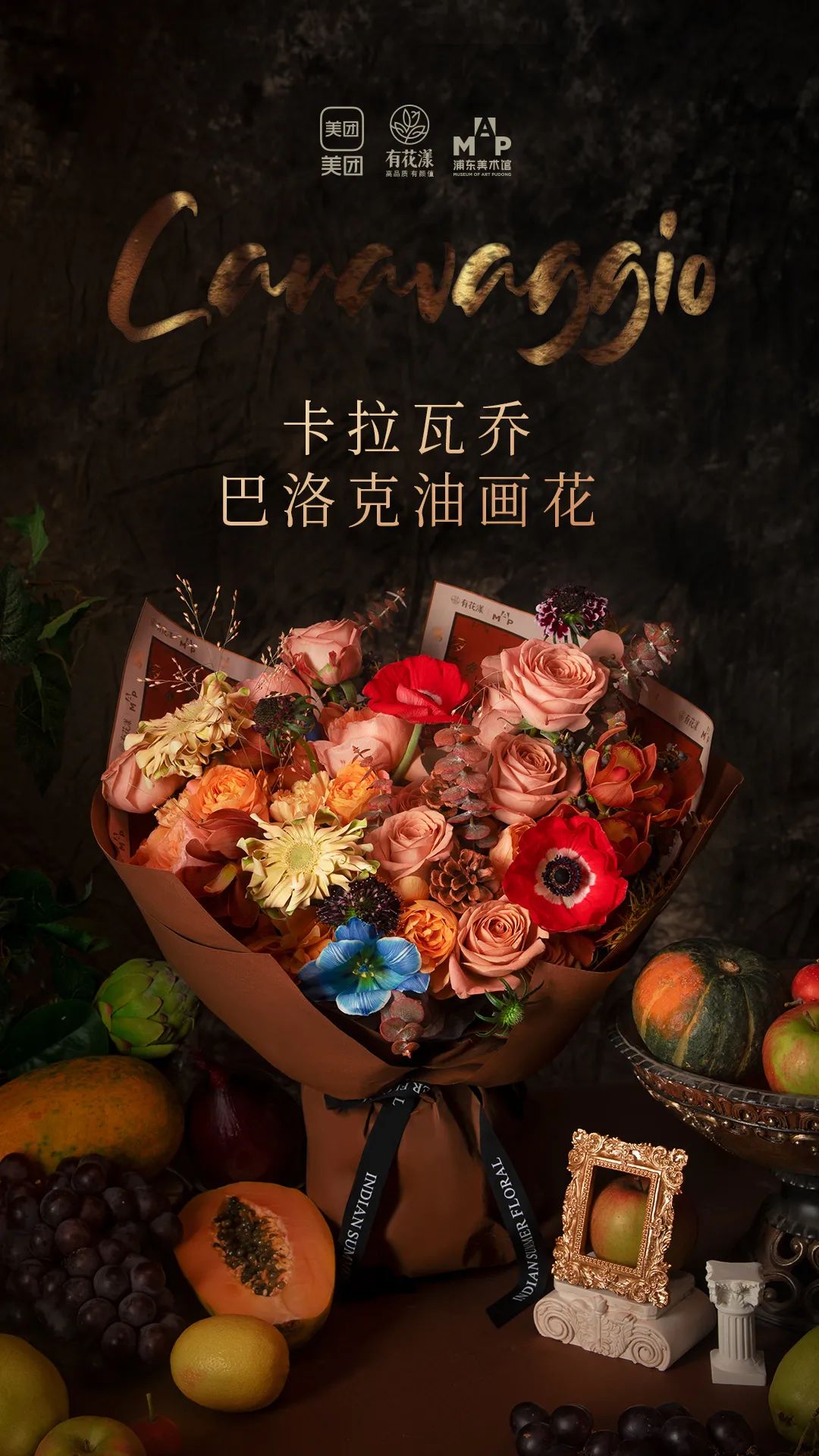 从浦东美术馆正在展出的年度收官大展“卡拉瓦乔与巴洛克奇迹”中汲取灵感,浦东美术馆近日携手美团“有花漾”联合打造了巴洛克油画风捧花;在浦东美术馆内1F大厅和3F东方明珠之窗前,搭建了颇具氛围感的高颜值鲜花装置;还推出了拍照打卡免费赠送巴洛克小花束的冬日暖心活动。