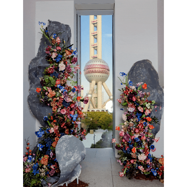 浦东美术馆与美团的此次合作,将花艺自然嵌入美术馆建筑,为观众们提供了从浦东美术馆望向东方明珠塔的全新美学视角,同时也探索了美术馆里的人与建筑互动的崭新可能。