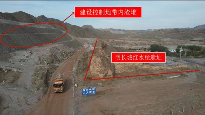 图1 2023年10月13日,督察组暗查发现,景宇矿业有限责任公司的渣堆位于明长城红水堡遗址建设控制地带内二是矿产开采资源浪费严重。2020年4月国家有关部门印发的矿产地质勘查规范规定,需进行选矿的铁矿石最低工业品位为25%。督察发现,白银市黄家洼地区砂石矿中伴生的微量磁铁平均品位只有5.5%,不符合铁矿开采条件。2020年5月,甘肃泰隆森矿业有限公司为了获取铁矿资源,在无法获得铁矿采矿许可的情况下,申请取得该地区的建筑用砂岩采矿许可证,实际是以采砂为名、行采铁之实。2021年1月至2023年10月,共开采砂岩1976万吨,从中采选出铁精粉59.5万吨全部销售,而主矿种砂岩仅销售0.32万吨,其余1900余万吨作为尾矿堆存在采区内,造成砂石资源严重浪费。同时,该矿环保设施建设管理不到位,粉尘污染十分严重。