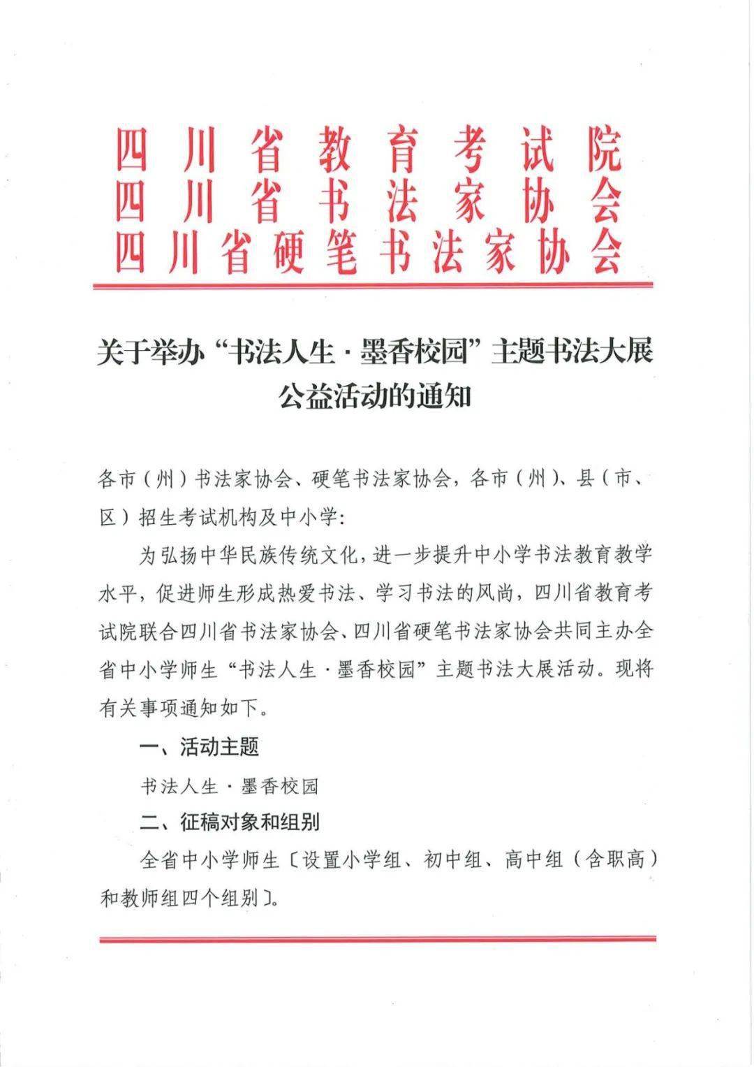 本次主题书法大展公益活动,从2023年12月20日开始公开征稿(不收取任何费用),2024年4月5日截稿,5月中旬公布获奖信息,5月25日在成都举办颁奖典礼。在“书法人生·墨香校园”总主题下,鼓励投稿师生书写追求真善美、传递正能量的诗、词、曲、赋、联、文等,也可自撰符合该主题的文字内容。组委会和评委会聘请著名书法专家、学者组成评审组。活动分小学组、初中组、高中组(含职高、中专)和教师组4个组别;小学组和教师组分设一等奖各10名,二等奖各20名,三等奖各30名,优秀奖各100名;初中组和高中组(含职高、中专)分设一等奖各5名,二等奖各10名,三等奖各15名,优秀奖各50名;荣获等级奖的师生将获得奖金和荣誉证书;获奖作品将在线举办主题书法大展;部分优秀作品将汇编成集或公开出版发行;同时,对于书法征稿活动宣传和组织较好的学校还将颁发优秀组织奖。