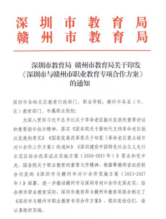 近日,深圳市教育局与赣州市教育局结合两市职业教育实际,联合印发《深圳市与赣州市职业教育专项合作实施方案》(以下简称《实施方案》)。这是两市深入贯彻习近平总书记关于革命老区振兴发展的重要讲话和重要指示批示精神,进一步推动赣州市与深圳市对口合作走深走实的具体行动,是打造职业教育融湾桥头堡的又一重大举措。