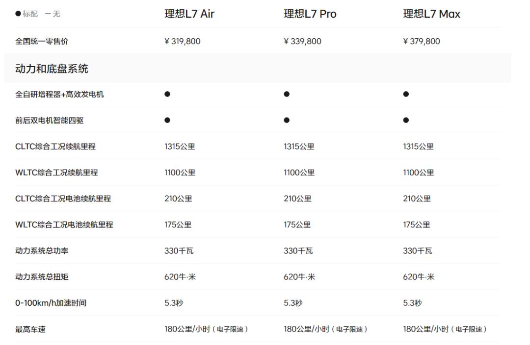 据了解,理想L7于今年2月正式上市,售价区间为31.98万元-37.98万元。作为理想汽车推出的首款五座产品,理想L7定位豪华中大型SUV,搭载增程式混动系统,CLTC工况综合续航里程1315公里,纯电续航里程210公里,最高车速可达180公里/小时。