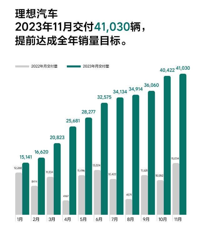 截至2023年11月30日,理想汽车全年累计交付32.57万辆,提前达成2023年30万辆销量目标。同时,理想L9、理想L8、理想L7三个车型累计交付量均已突破10万辆,在各自细分市场保持销量领先。