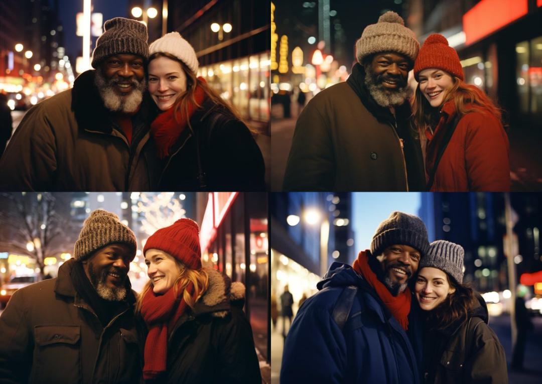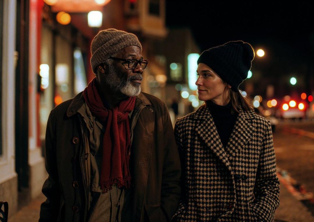 输入提示:「电影镜头,一个 50 岁留着灰胡子、穿着棕色夹克、戴着红色围巾的黑人男子站在一个 20 岁左右的白人女子旁边,她穿着深蓝和乳白色千鸟格外套,戴着黑色针织帽。午夜,他们走在街道中央,被路灯柔和的橙色光芒照亮。」
