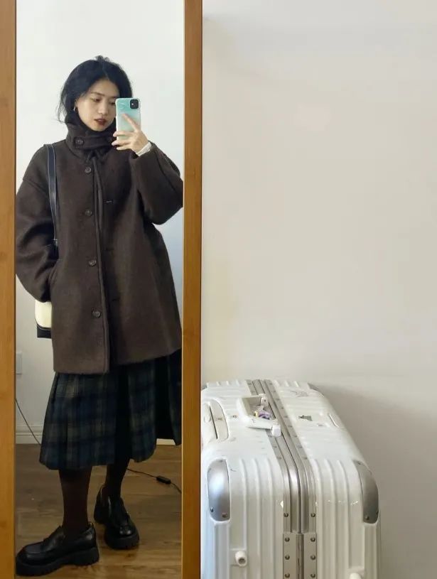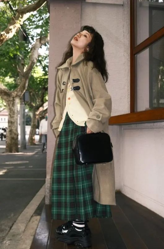 冬天的毛呢格子裙可以配很多材质,最佳的选择当然是毛呢大衣啦!