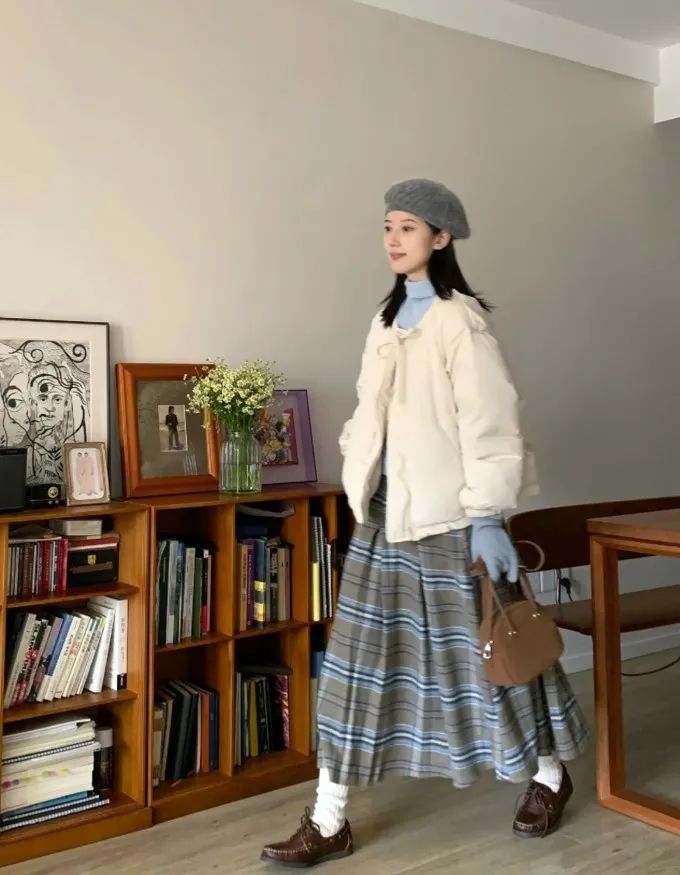 大裙摆的格子裙更有年轻青春的活力,搭配短款配羽绒服温柔减龄。