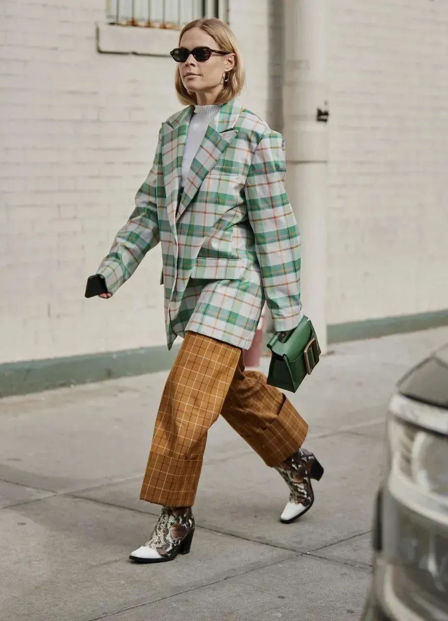 格纹裤给人中性率性的感觉,驾驭起来相对于其他裤装更有难度,适合中性帅气的小姐姐。搭格纹裤子的外套,也需要帅气一点。