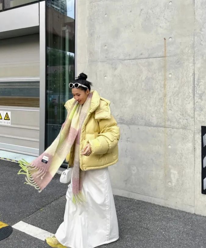 黄色系的羽绒服搭配一件粉黄色的围巾,整个人温柔气息up!
