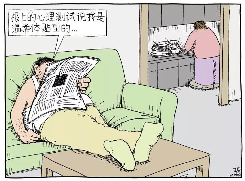 厨房里女人忙到崩溃,客厅里的男人却熟视无睹,像巨婴一样舒舒服服躺在沙发上看报纸。