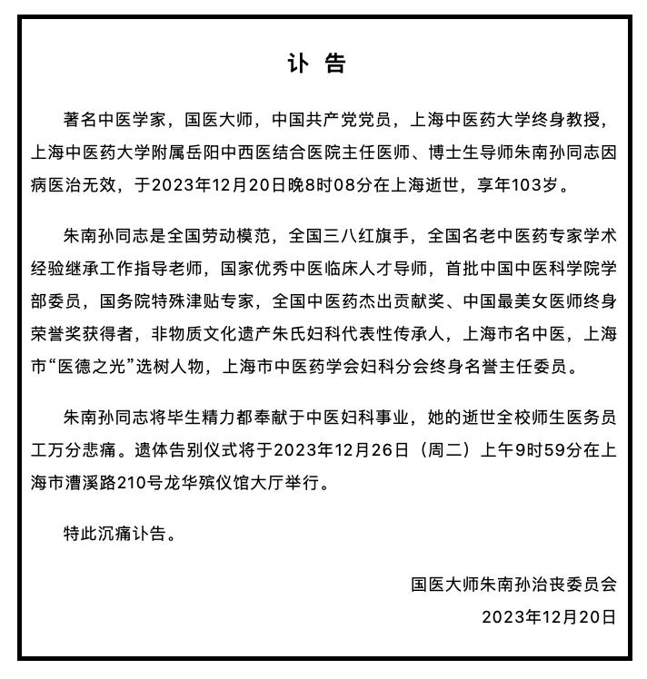 12月21日上海中医药大学发布讣告,国医大师,上海中医药大学终身教授朱南孙去世,享年103岁。①
