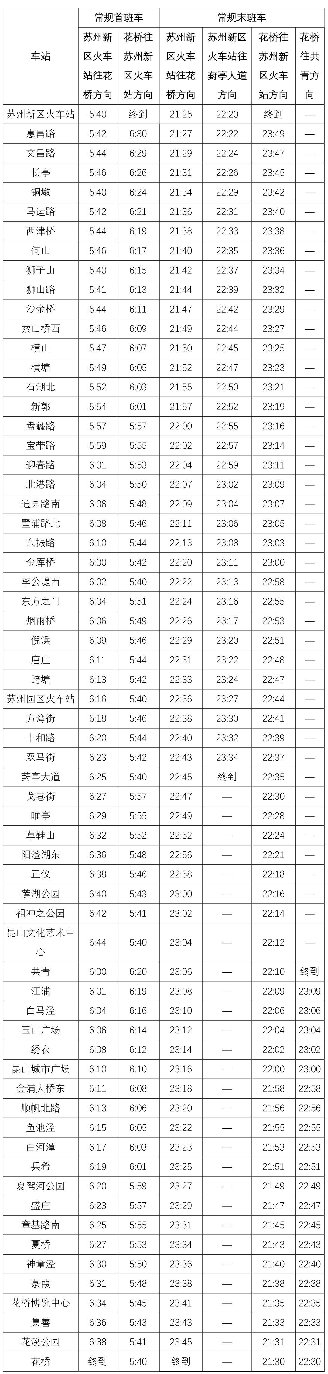 苏州轨交11号线、3号线两个交路运营服务时间均为5:40-22:30,各站首末班车时刻见下表: