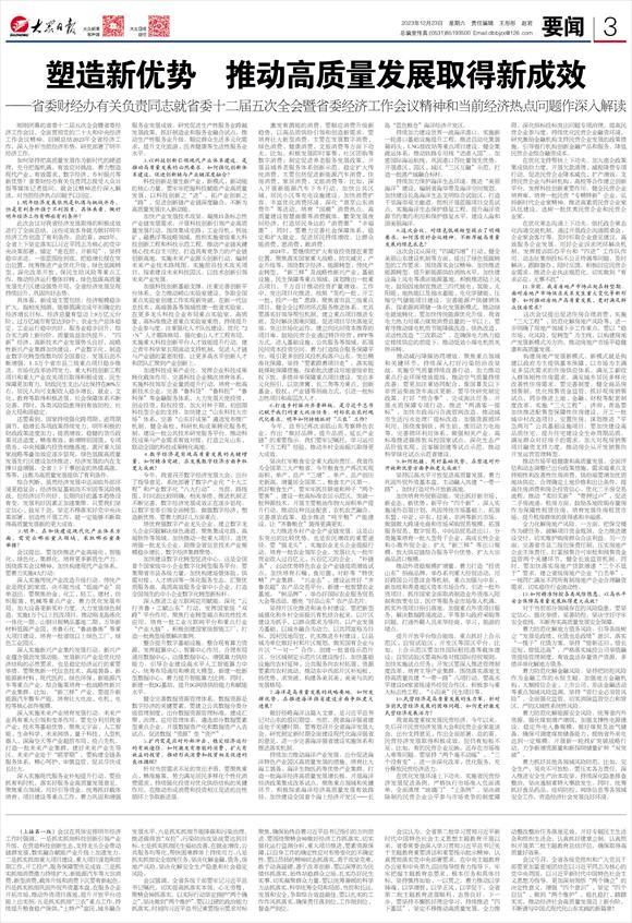 刚刚闭幕的省委十二届五次全会暨省委经济工作会议,全面贯彻党的二十大精神和中央经济工作会议精神,回顾总结2023年全省经济工作,深入分析当前经济形势,研究部署了明年经济工作。如何坚持把高质量发展作为新时代的硬道理,充分把握机遇,有效应对挑战,着力塑造现代产业、有效需求、数字经济、乡村振兴等新优势?省委财经办有关负责同志接受大众日报等媒体记者提问,就会议精神进行深入解读,对当前经济热点问题予以回应。