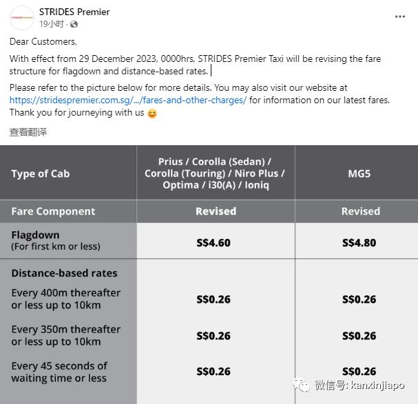 本月22日,SMRT旗下的腾越宝威(Strides Premier)在脸书宣布,从12月29日起调高车资,所有出租车的起程车资上调5角,车程距离收费和等候费上调1分,增至2角6分。