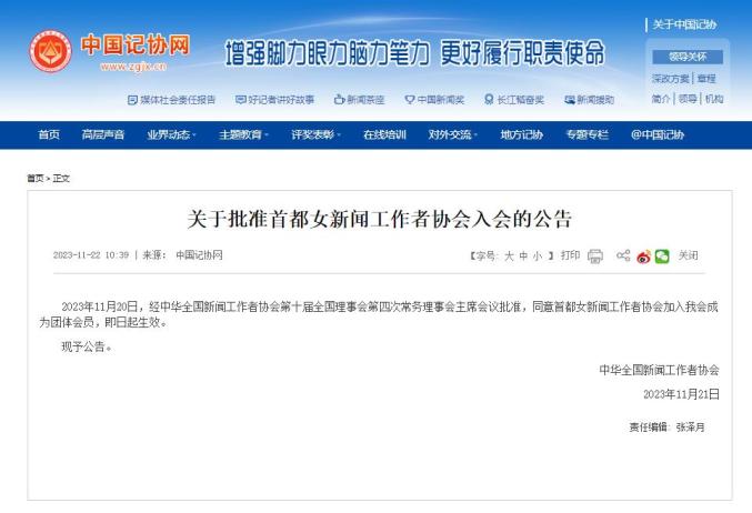 11月21日,中华全国新闻工作者协会发布公告:2023年11月20日,经中华全国新闻工作者协会第十届全国理事会第四次常务理事会主席会议批准,同意首都女新闻工作者协会加入我会成为团体会员,即日起生效。