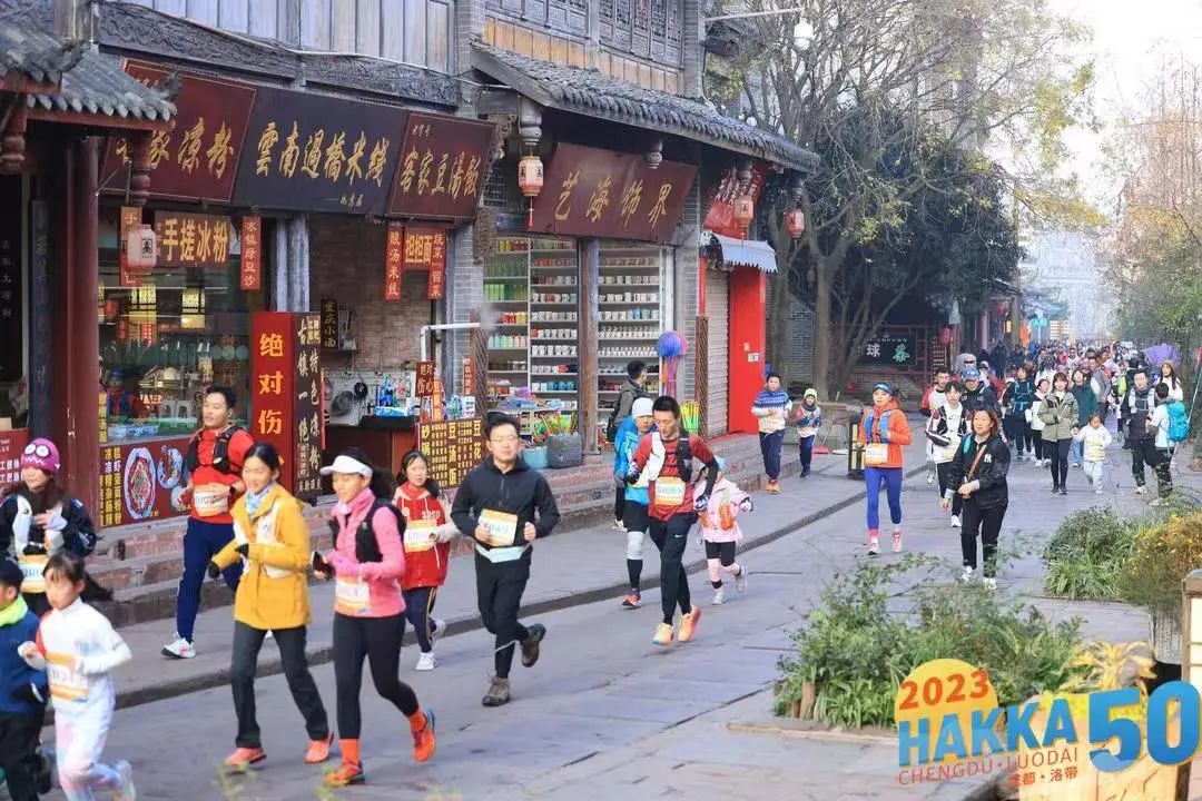HAKKA50是洛带古镇户外跑步品牌,自从2019年在洛带古镇首次尝试开展户外跑步活动以来,已举办50余场赛事活动。2023年成都洛带·HAKKA50的赛事线路在成熟赛道基础上经过精心设计:迎着晨光,选手们从西部客家第一镇出发,穿过千年甑子场,进入薄雾弥漫的龙泉山,踏过黄叶点缀的小径,登上蜿蜒盘旋的金龙长城,沉浸式感受古镇人文风光与冬日山野美景,伴随着热情的观众和游客的欢呼鼓劲,冲向征途的终点。