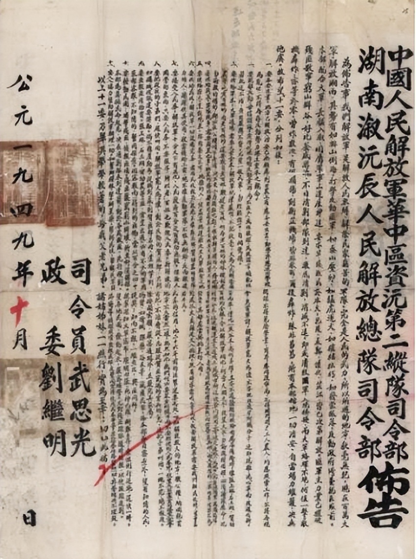1949年10月1日,湖南淑沅辰人民解放总队司令部发布布告号召民众迎接解放军进入湘西。