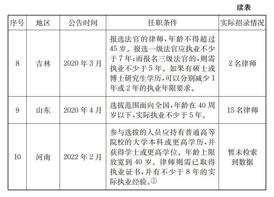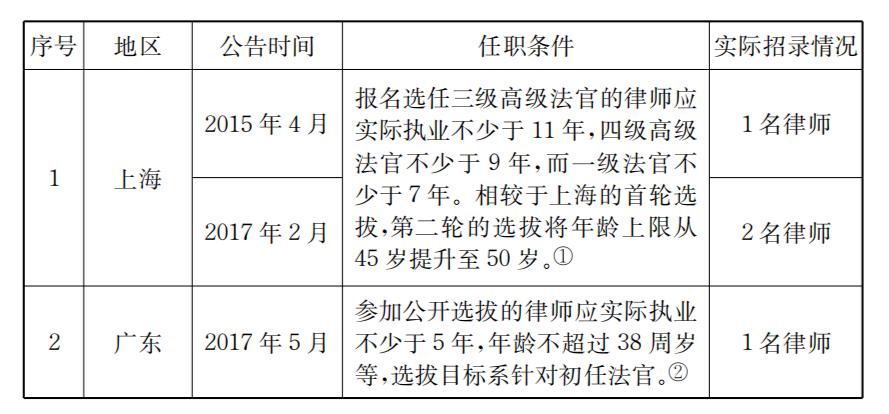 目前我国法官的来源主要有两种途径,第一种是从法官助理中进行初任法官遴选,另一种是律师转任法官机制。律师转任法官机制是伴随着法官员额制改革作为法官精英化的重要手段正式进入制度层面的。2015年4月,上海全面推动司法改革,确定司法人员比例,建立了司法人员的分类管理制度,并引入了律师转任法官的机制。2015年4月,上海市高级人民法院经过公告、报名、资格审查、书面考试和面试等流程,最后由法官遴选委员会对3名合格面试者进行投票。最终,笔者被推选为三级高级法官的建议人选,并由遴选委员会推荐给上海市高级人民法院。上海首次从律师中选拔法官受到社会的普遍关注,然而近年来律师转任法官制度的实施并不顺畅,集中表现为选拔比例低、实施选拔地区少、选拔次数少等。笔者自2014年就开始关注从律师中选拔法官的实践。历经9年跟踪观察10次实践情况,笔者按照时间、地区、任职条件以及实际招录情况进行了信息整理。