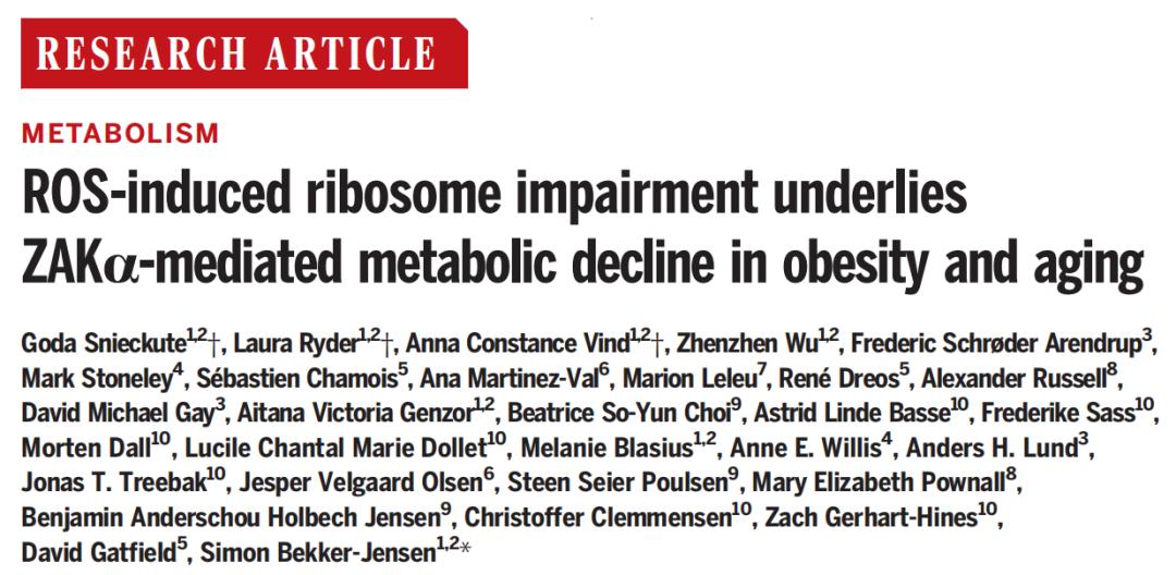 2023年12月8日,哥本哈根大学健康老龄化中心的 Simon Bekker-Jensen 教授团队在国际顶尖学术期刊 Science 上发表了题为:ROS-induced ribosome impairment underlies ZAKα-mediated metabolic decline in obesity and aging 的研究论文。