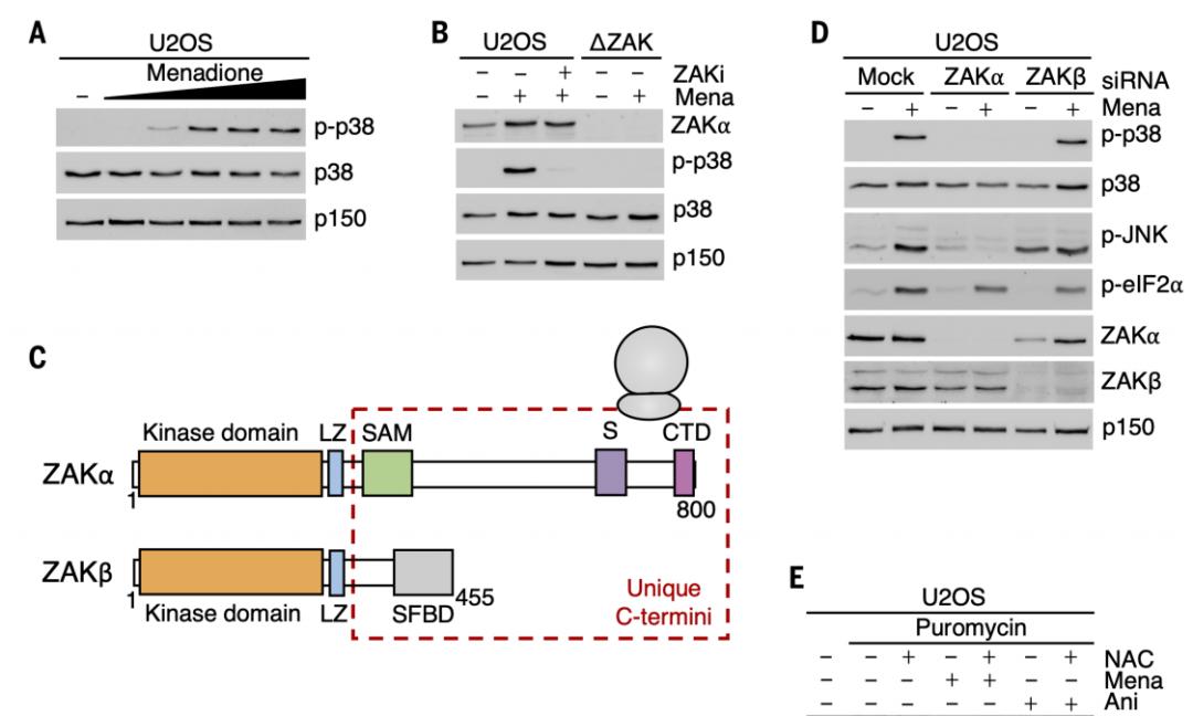 ROS抑制核糖体翻译并激活核糖体毒性应激反应(RSR)研究团队于是将研究重点聚焦于一种名为ZAKα的MAP3K应激激酶蛋白上。ZAKα通过两个C端结构域与核糖体结合,并被核糖体的停滞/碰撞等扰动激活,以此监测核糖体功能。