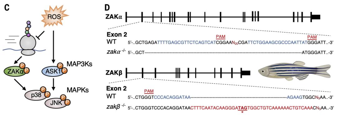 紧接着,研究团队使用活性氧(ROS)生成剂处理斑马鱼幼体,并发现其可触发核糖体损伤和ZAKα激活。作为反证,敲除ZAKα基因的斑马鱼幼体可以免受ROS诱导的病理影响,这可能是ZAKα敲除预防了核糖体毒性应激反应(RSR)诱导的程序性细胞死亡。