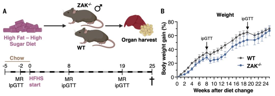 敲除ZAKα基因的斑马鱼幼体可以免受ROS诱导的病理影响与此同时,ZAKα基因敲除小鼠可以防止高脂高糖(HFHS)饮食诱导的代谢适应不良的早期表现,包括血糖不耐受和肝脏脂肪变性,并且相比于正常小鼠更瘦、脂肪更少。此外,HFHS饮食喂养的小鼠肝脏表现出ZAKα激活的核糖体延伸动力学畸变,证明了核糖体毒性应激反应(RSR)在代谢调节中的重要作用。