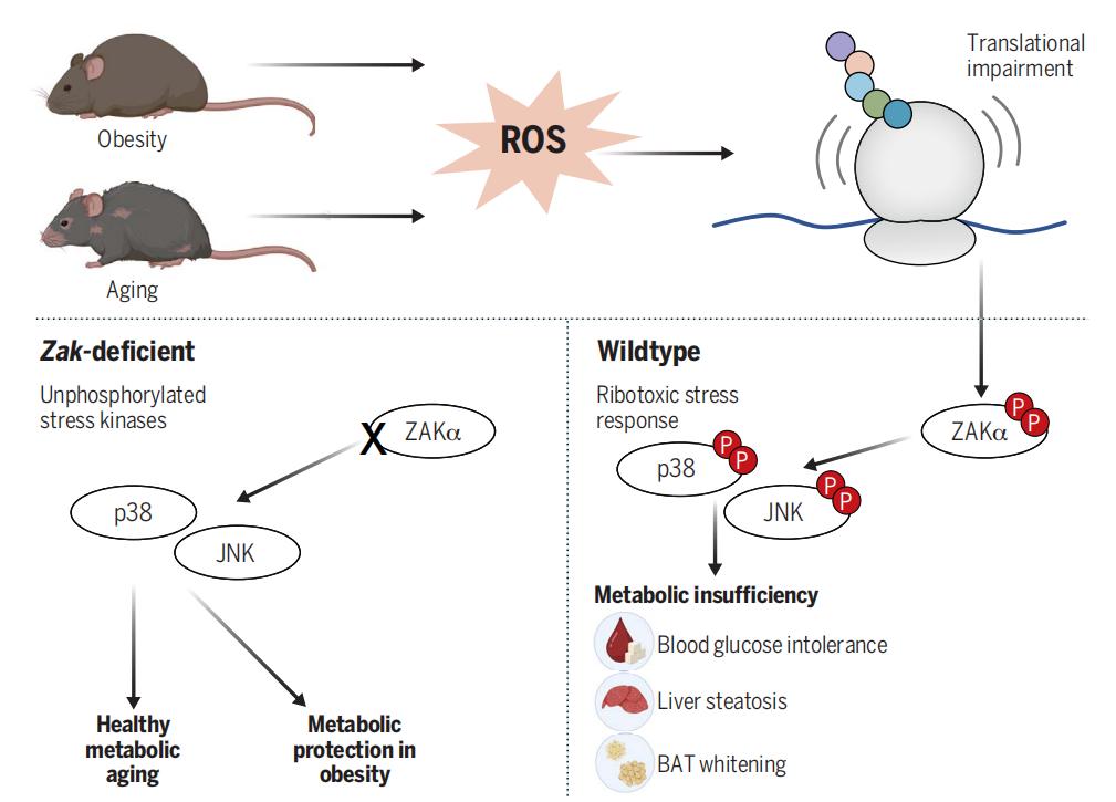 该研究确定了一种分子机制,将活性氧(ROS)、一种名为ZAKα的应激激酶蛋白与核糖体功能的变化联系起来,并证明了ROS诱导的核糖体损伤是ZAKα的生理激活信号,同时也是导致肥胖和衰老相关代谢疾病的“罪魁祸首”。这些研究结果更深入地揭示了潜在的代谢信号通路,为肥胖症、衰老以及相关代谢疾病的治疗打开了新的大门。