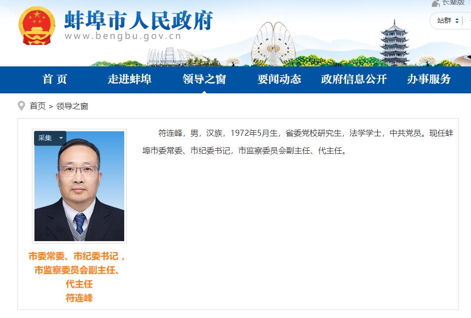 据蚌埠市人民政府官网“领导之窗”栏目更新显示:符连峰已任蚌埠市委常委、市纪委书记,市监察委员会副主任、代主任。
