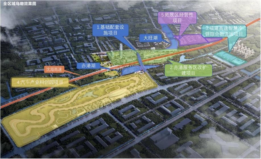 全区域鸟瞰效果图福建赤港服务区双开放资源综合开发项目分三期实施,一期、二期建设期4年,运营期30年,建设内容有基础配套设施、赤港服务区改扩建(含休闲农场)、福建高速智慧冷链综合物流园、汽车产业科创园、拓展区经营性等5大项目板块。