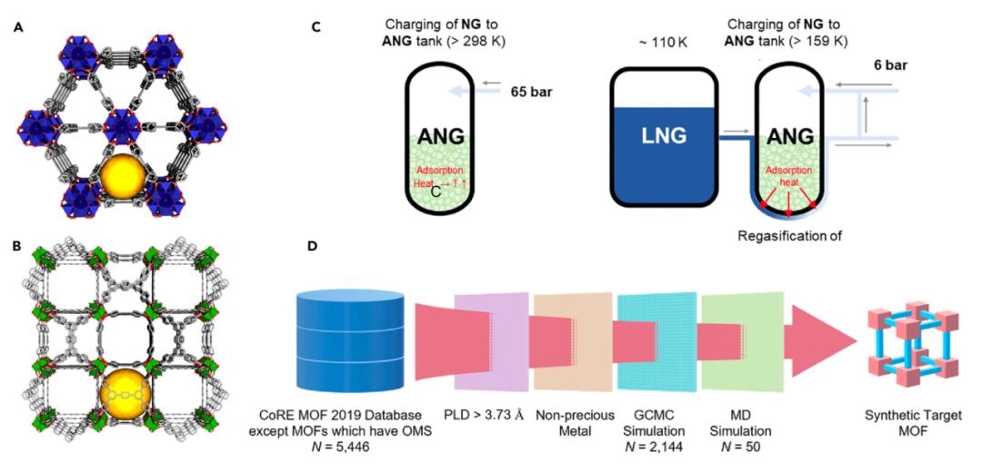 图2 MOFs、MOF 复合材料和 MOF 衍生物及其转化与传统多孔吸附剂(如沸石和活性炭)相比,MOF基材料由于其独特的结构特征、优异的孔隙率、固定的功能位点以及对客体分子的尺寸选择性,在高密度燃料气体储存方面具有明显优势。作者在论文中指出,MOF基材料对H2和CH4的吸附能力远优于传统的多孔吸附剂。MOFs还可以将CH4固定在孔隙中形成水合物,显著降低了CH4在存储/运输过程的压力。除此之外,随着机器学习与高通量筛选的不断发展,科学家们已经可以快速地对MOFs的气体储存能力进行初步预测,并不断改进,从而更快地达到美国能源部对储气材料设定的性能标准。