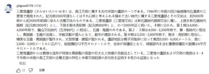 还有玩家在评论中对三星堆遗址做出了详细的介绍,以便观看者们对联动内容产生更直观的了解。