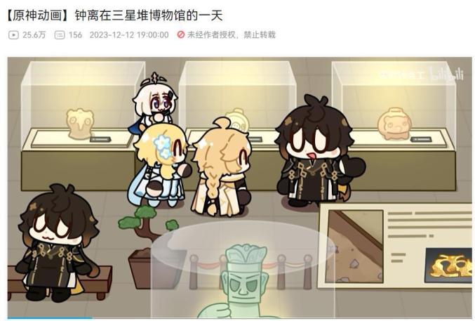 12月18日,米哈游发布《原神》与三星堆博物馆联动的宣传视频《仰观千秋,俯察万象》,以传统的说书人口吻,讲述了一段原神代表性角色钟离梦游奇境的故事,经由创意想象、结合研究考据,经典三星堆青铜器物复现在如“桃源村落”般的生活场景中。