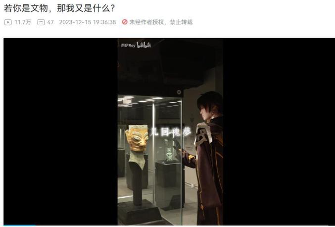 在B站和微博上,我们看到了许多描绘钟离成为导游或者讲解员,来到三星堆博物馆的同人视频和绘画作品。更有忠实玩家亲自穿上了钟离的cosplay服装,亲自前往博物馆,让虚拟与现实以另一种方式交汇。