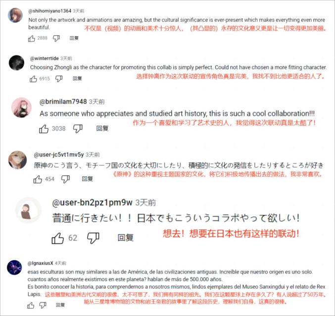不仅在国内,打开海外视频平台的《原神》宣传视频,来自世界各地的玩家们留下了评论,表达了他们对本次联动的支持和喜爱。