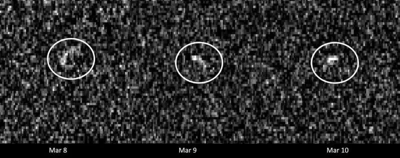 2021 年 3 月,小行星阿波菲斯的这些图像由加利福尼亚州深空网络戈德斯通综合体和西弗吉尼亚州绿岸望远镜的无线电天线记录下来。这颗小行星距离地球1060万英里(1700万公里),每个像素的分辨率为127英尺(38.75米)。图片来源:NASA/JPL-Caltech 和 NSF/AUI/GBO这艘前OSIRIS-REx航天器开始了研究小行星阿波菲斯的旅程,并利用了这颗小行星2029年飞越地球的机会,自有记录以来,类似的情况从未发生过。
