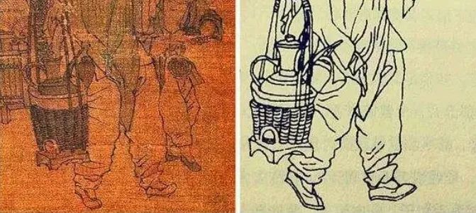 在南宋刘松年的《茗园赌市图》中,画面右侧绘有一个卖“上等江茶”的小贩。他旁边的女子,拎着一个藤编篮子,里面放着一个大茶壶。