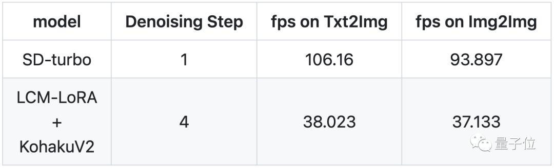 经测试,使用SD-turbo模型在去噪步骤为1步的情况下,文本-图像每秒帧率可达106,图像-图像每秒帧率达到93。CM-LoRA+KohakuV2模型在4步的情况下,文本-图像每秒帧率为38,图像-图像每秒帧率为37。