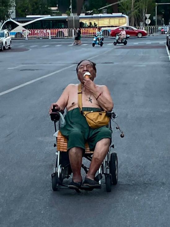 ▲7月9日傍晚,北京市东城区,一位坐着电动轮椅的大爷吃着肯德基甜筒。