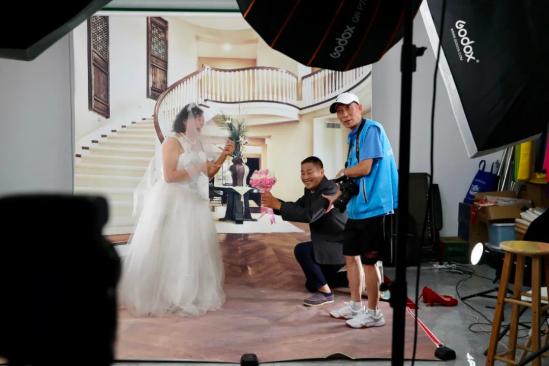 ▲8月21日,七夕来临,北京朝阳区安贞街道党群服务中心,摄影师正在给社区的老年夫妻免费拍婚纱照。