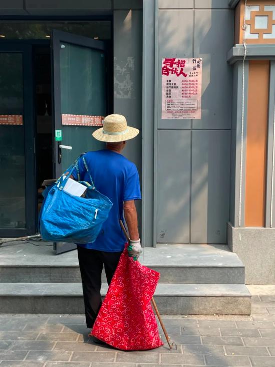 ▲9月16日上午,北京市东城区安德路,一位拾荒者在路边看招聘启事。