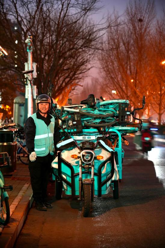 ▲12月4日晚,北京市海淀区白堆子地铁站,为共享单车调度员吴明昌拍摄的肖像。